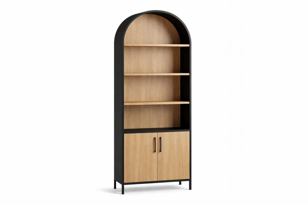 Étagère armoire arquée en bois noir et chêne avec 4 étagères et 2 portes, hauteur 180 cm