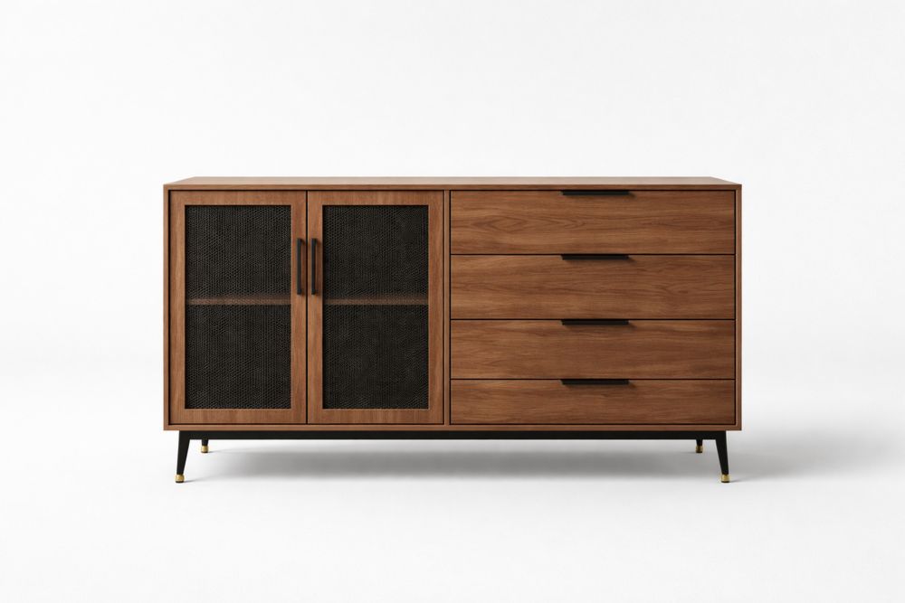 Buffet en bois massif avec portes en treillis métallique et tiroirs