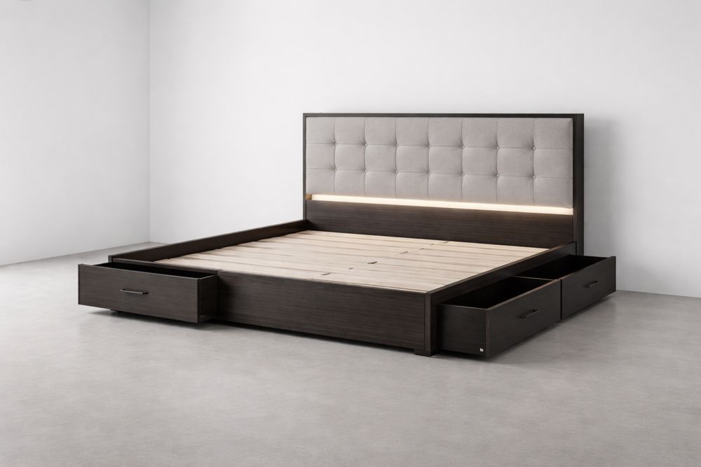 Cadre de Lit Double avec Rangement en Bois Massif Foncé et Tête de Lit Rembourrée Beige