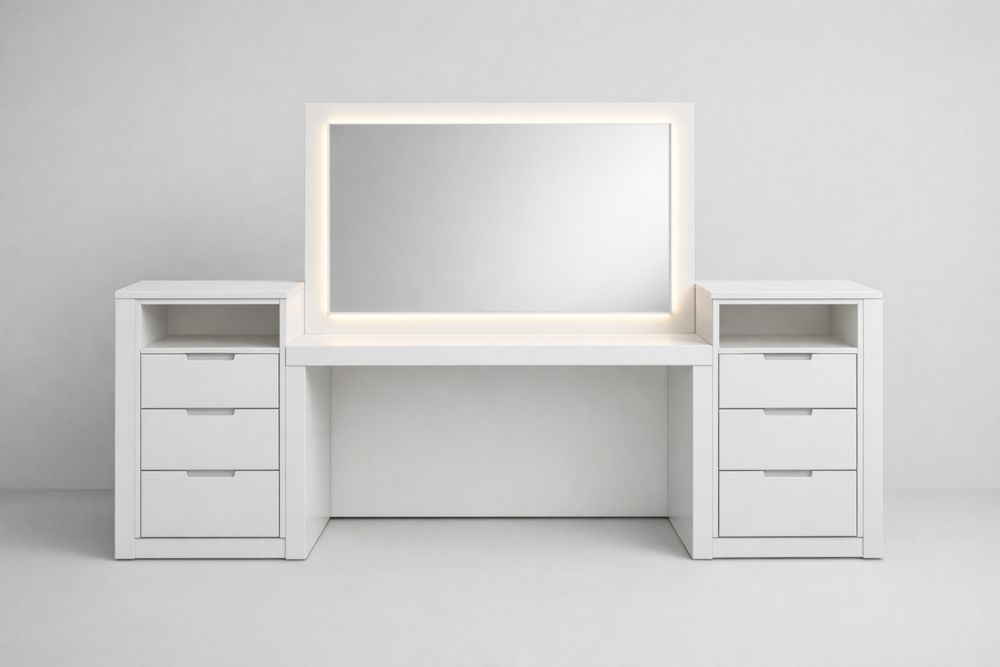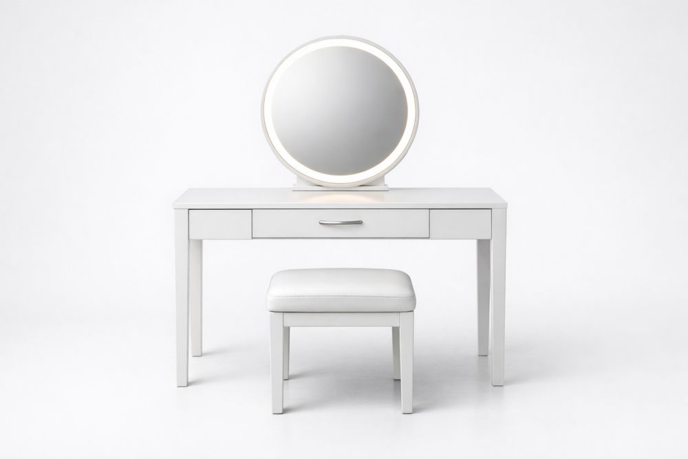 Coiffeuse blanche avec miroir LED et tiroirs en bois MDF