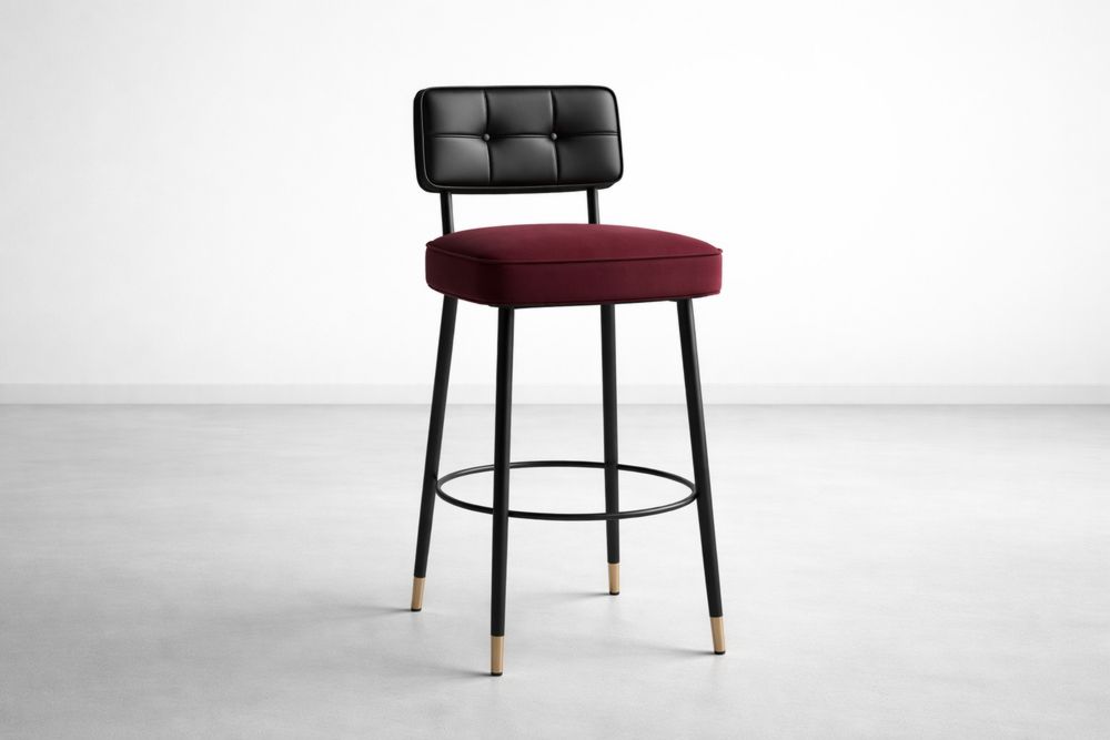 Tabouret de bar en acier noir et tissu polyester bordeaux avec dossier rembourré