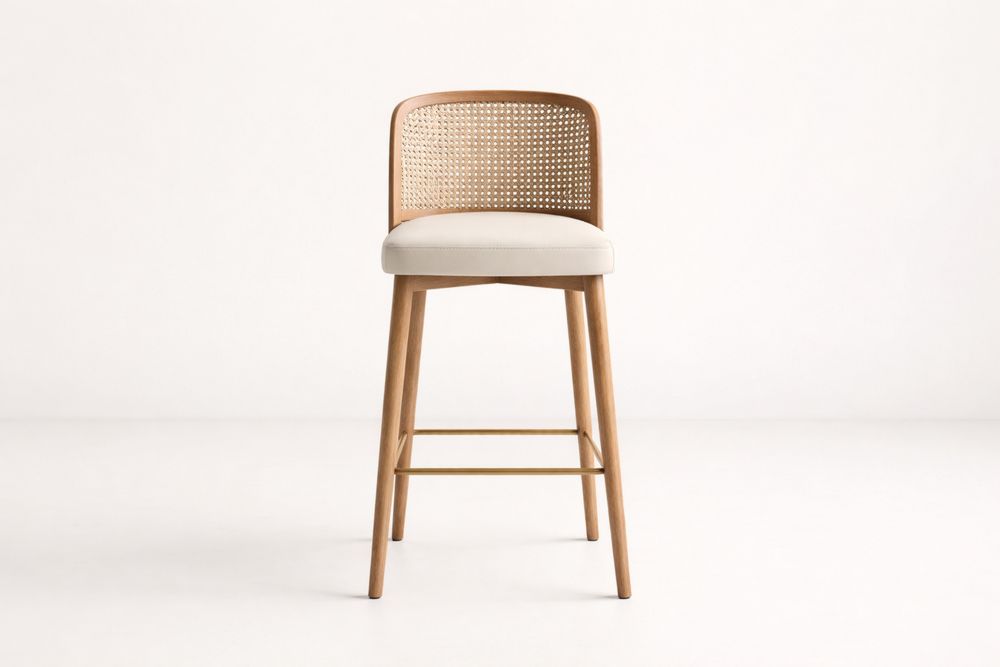Chaise de bar en bois massif avec assise tissu polyester beige et dossier en cannage